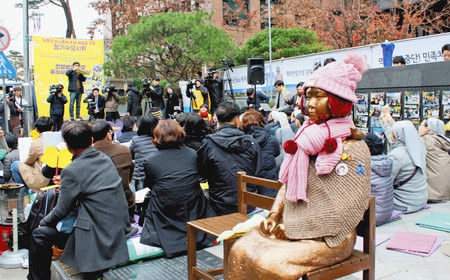 ソウルの日本大使館前に設置された少女像前でこの日開かれた元慰安婦を支援する集会では、「日本軍性奴隷制問題解決のための正義記憶連隊」の尹美香(ユンミヒャン)代表が、病床にある元慰安婦の「残ったのは日本政府の謝罪と賠償だけだ」との言葉を紹介。取材に応じて「(慰安婦)被害者が勝った」と述べた。日本が拠出した十億円の早期返還に向けて、両国政府が協議しなくてはいけないとも主張した。