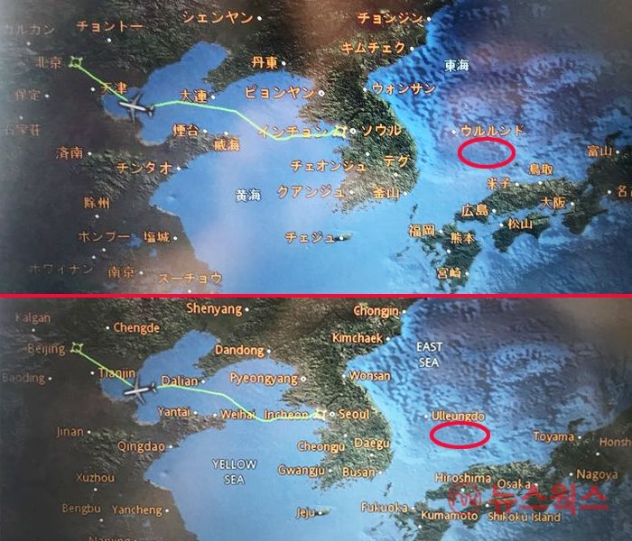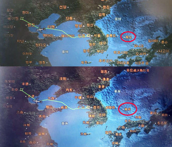 18日、Aさんによれば、アシアナ航空のビジネスクラスに設置された乗客用モニターの航路地図で、独島が削除されている事が判明した。Aさんは去る8日に仁川(インチョン)国際空港から中国(チュングク)北京(ペイジン)に向かうアシアナ航空旅客機に乗り、このような事実を確認した。