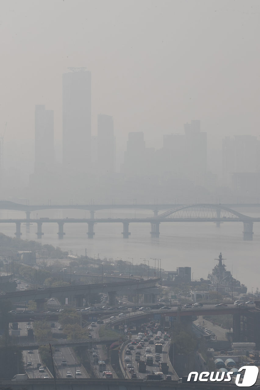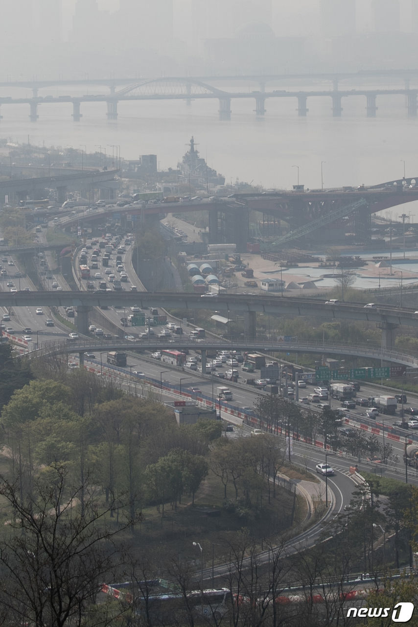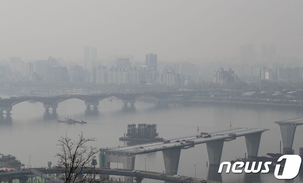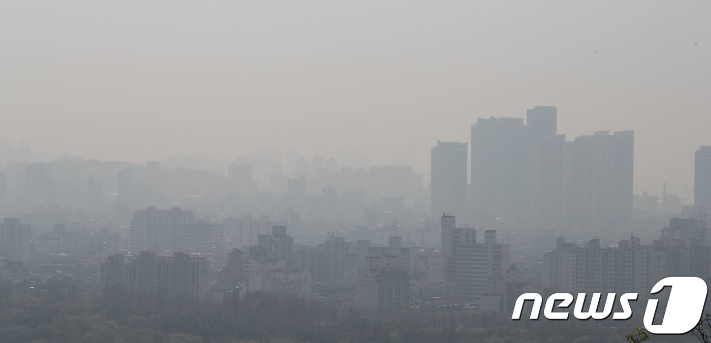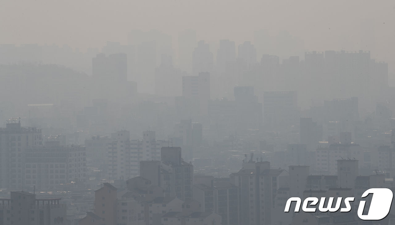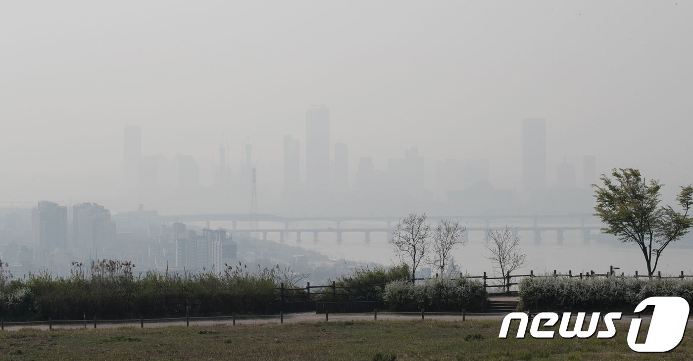 首都圏の粉塵濃度のレベルが『悪い』を示した20日午前、ソウル麻浦区(マポグ)のハヌル公園から見た都心が霞んでいる。