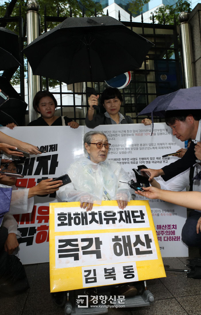 正義連のハン・ギョンヒ事務総長は、「ハルモニがは全員高齢で健康も良くないが、自分ができる事は全てした」と言いながら、「和解治癒財団の解散が外交的な計算で延期しているという気がする。この問題は正義の問題で計算する問題ではない」と話した。