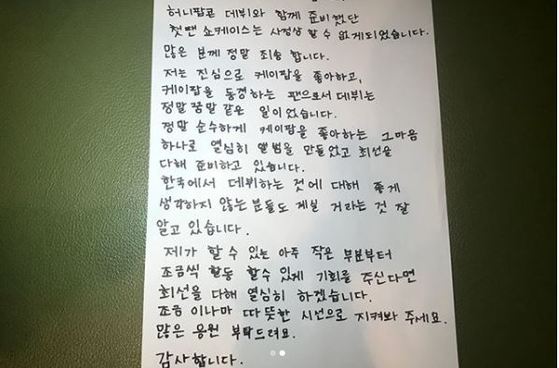 彼女は、「K-POPが大好きなメンバーが集まって一生懸命最善を尽くしてアルバムを作って準備しております」とし、「お待たせしていたファンの皆さん大変申し訳ございません」と述べた。続けて、「とても未熟な私達ですが、少しだけ暖かい目で見守って応援して頂けたらありがたいです。今後とも宜しくお願い致します」と付け加えた。