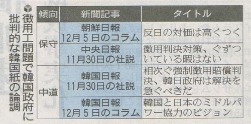 新聞は12月5日付の朝鮮日報のコラムを引用して、「保守系も朝鮮日報は “反日の対価は高い” という見出しの論説委員のコラムを載せ、「50年余り維持してきた合意や約束を覆せば相手が反発して関係が悪化するだろうという事は誰でも分かる事ではないのか」と論じ、「1965年の日課請求権・経済協力協定に反する判決自体を批判した」とし、「(朝鮮日報は)“日本が各種協定の破棄に乗り出してもおかしくない” と警告した」と伝えた。