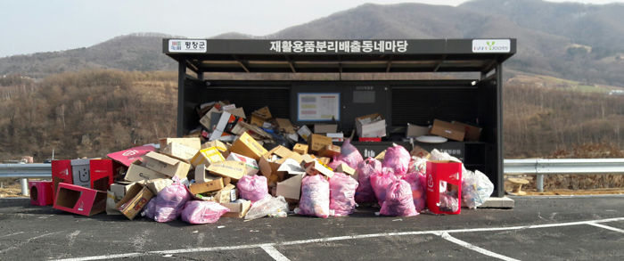 しかし、五輪が閉幕しても、リサイクルごみだけでなく一般ごみも処理が遅れている。駐車場内に設けられたリサイクルごみ用の集積場には、一般ごみも含めてあらゆるごみが山積みになっていた。ごみ分別のために設置された鉄製のキャビネットは、ごちゃごちゃになったごみが扉の外まであふれ出していた。リサイクルできないごみからは悪臭が漂っていた。長期にわたって放置されていた上、ここにきて気温が上昇しているからだ。一部のごみは江原道特有の強風で飛ばされ、駐車場のあちこちに散らばっていた。横渓里のある地区長は「このままでは飛んできたごみで村の谷間がごみ置き場のようになってしまう」と嘆いた。