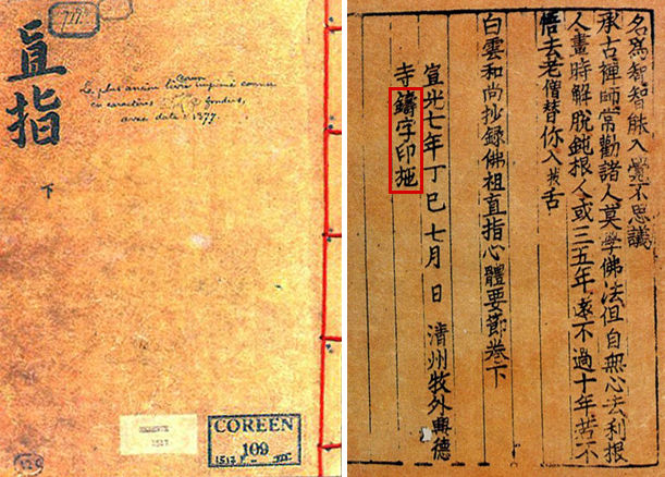 ▲直指心体要節。ドイツのグーテンベルクより78年早く1377年、清州興徳寺で刊行された世界最古の金属活字本。