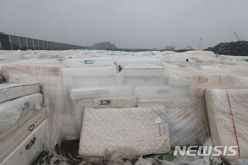 肺がん誘発物質「ラドン」が検出された寝具メーカー、テジンベッドのマットレスが忠清南道唐津市からほかの地域に搬出される予定だったが、住民たちの反対により運び出すことができず、唐津港の野積場では26日、テジンベッドのマットレスが山積みとなっている。
