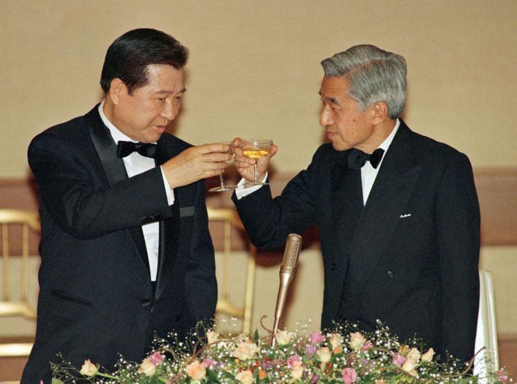 ▲明仁日王は在任時、訪日した我が国の首脳たちに着実に会い、韓国訪問を打診してきた。写真は1998年10月7日、日本東京を訪問した近代中(キム・デジュン)元大統領と明仁日王が晩餐で乾杯する姿。[イメージ出処=聯合ニュース]