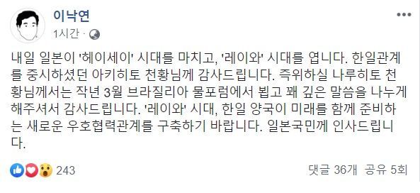この日、李洛淵(イ・ナギョン)総理も自身のフェイスブックに「韓日関係を重視された明仁天皇様に感謝申し上げる」と書いた。また「即位するナルヒト(徳仁)天皇様は昨年3月、ブラジリア水フォーラムでお目にかかってかなり深いお言葉をかけて下さって感謝申し上げる」と付け加えた。
