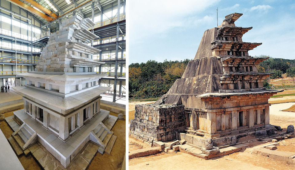 「東アジア最大規模の石塔」として知られる全羅北道益山市の弥勒寺址石塔(国宝第11号)が、20年にわたる修理作業を終えて20日、姿を現した=写真左=。