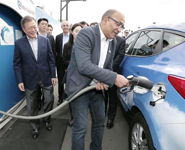 ▲現代自動車の製品を笑顔で見つめる文氏(左端)だが、韓国車の状況は厳しい(聯合=共同)