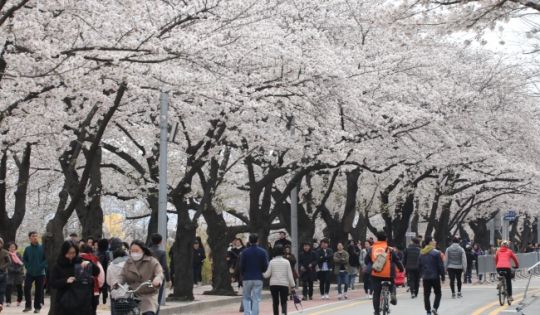 [肌寒い天候の中、ヨイドの桜祭りが始まった7日午前、市民たちがユンジュン路の桜道を歩いている。写真=聨合ニュース]