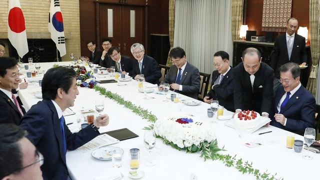 その場で安倍首相が文在寅大統領に就任1周年記念ケーキをサプライズで送った。