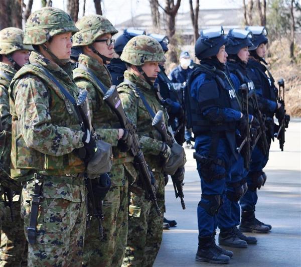 訓練には陸自施設教導隊と県警機動隊の計約80人が参加。自衛隊車両を県警の白バイが先導する緊急輸送訓練などを実施した。自衛隊と県警が共同で検問を実施する手順も確認した。