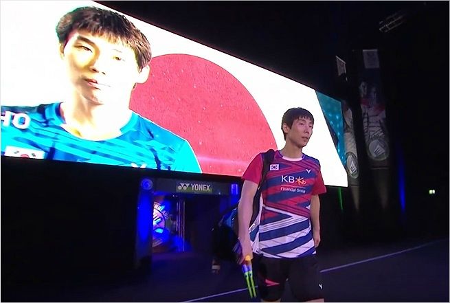 全英オープンは17日、英国バーミンガムで開かれた男子シングル4強戦で韓国のソン・ワンホ選手が入場する時、場内の大型電光掲示板にソン・ワンホが旭日旗を背景にポーズを取っている映像を流した。