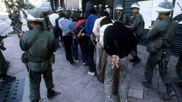 1980年、光州で拘束され兵士に囲まれる抗議者