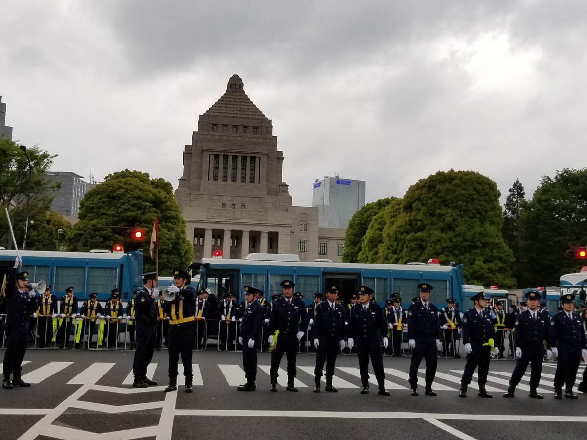 空間ができた国会前で、まだ厳重な警備を続ける警官たち。安倍宮殿を守ろうとしてるようにも見える。