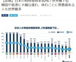韓国人「日本人が休暇を使えない理由。こういうのも日本の文化だったんですね…」韓国 日本人が休暇を使えない理由 日本の有給休暇取得率は50%で、世界最下位(エクスペディア・ジャパンは、合計1万1144人を対象に世論調査) 韓国と香港よりも大きく遅れをとっていて、休暇を取るのに罪悪感を感じる人々の数も、日 […] 続きを読む