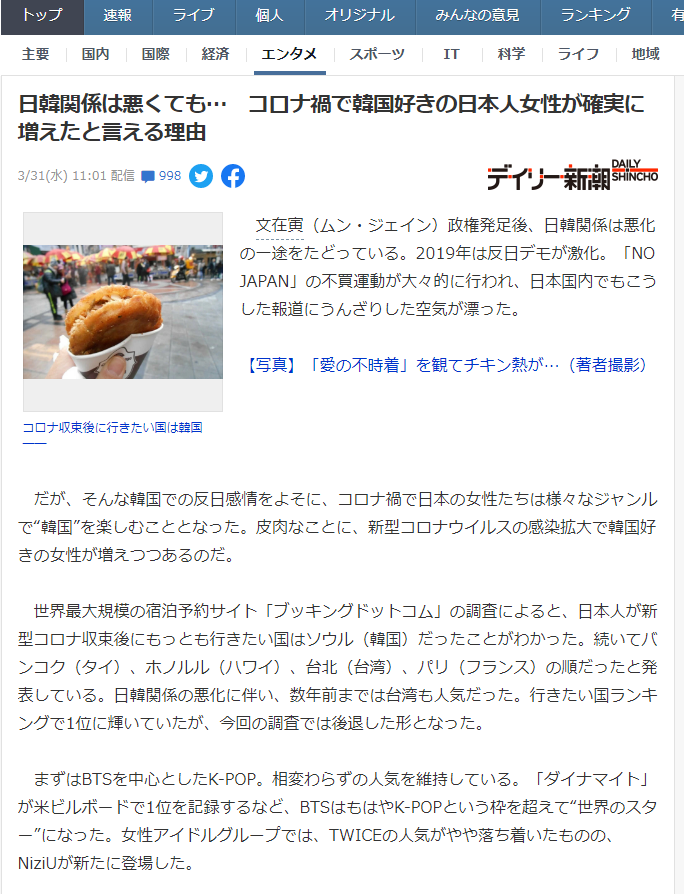 韓国人「韓国が好きな日本の女性が確実に増えた」韓国 日本コラム「韓国が好きな日本の女性が確実に増えた」 日韓関係は悪くても…コロナ禍で韓国好きの日本人女性が確実に増えたと言える理由 https://news.yahoo.co.jp/articles/140a3890c53 […] 続きを読む