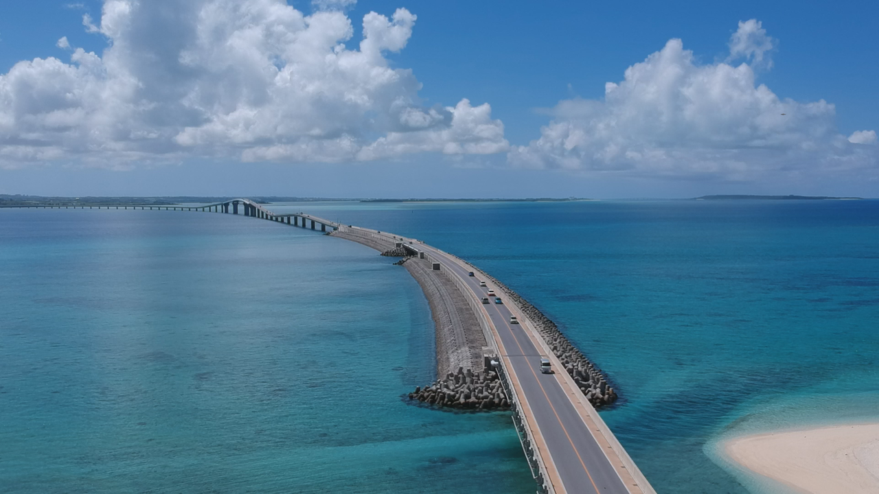 沖縄・宮古島の伊良部大橋をドローンで空撮した美しい写真だが、よく見ると右上に得体の知れない何かが浮かんでいる。