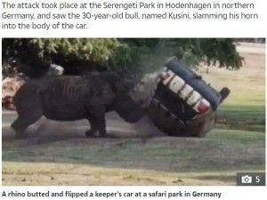 「HONK THE HORN! Terrifying moment angry rhino attacks keeper’s car and flips it three times as she escapes UNINJURED at safari park」』のスクリーンショット
