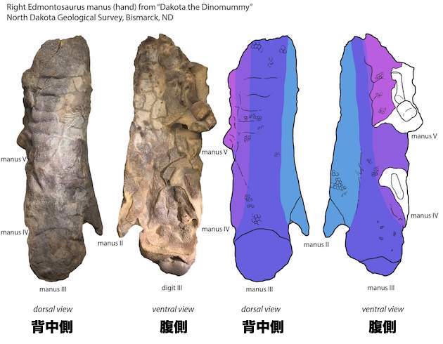 米ノースダコタ州のGeological Survey(NDGS)が17日、今から約6700万年前に生息していた草食恐竜「エドモントサウルス」の右手首と思われるミイラ化石を初公開。