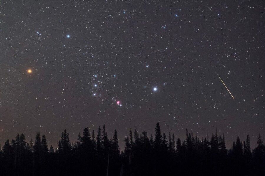 画像 地平線の上にかかるオリオン座の横を流れ落ちる流星。オリオン座は最も有名な星座の1つで、画面左端の明るく赤い星がベテルギウスだ。(PHOTOGRAPH BY BABAK TAFRESHI, NAT GEO IMAGE COLLECTION)
