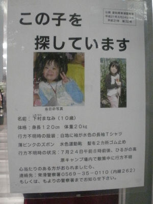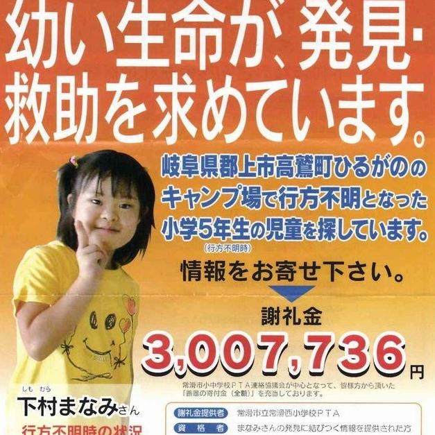 小学校の野外学習で岐阜県郡上市のひるがの高原キャンプ場に来ていた愛知県・常滑西小学校5年の下村まなみちゃん(当時10歳)が姿を消したのは2009年7月24日。間もなく10年になる。