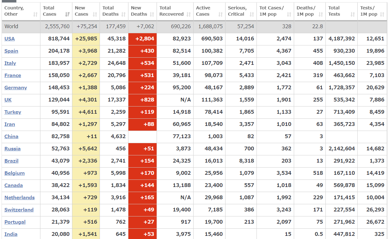 USA 感染者数 818,744 +25,985 死者数 45,318 +2,804