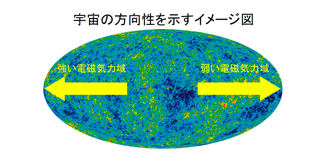 その結果、私たちの宇宙ではある特定の方向に行けば行くほど電磁気力が強くなり、それとは逆の方向に行けば行くほど電磁気力が弱くなっていることがわかりました。