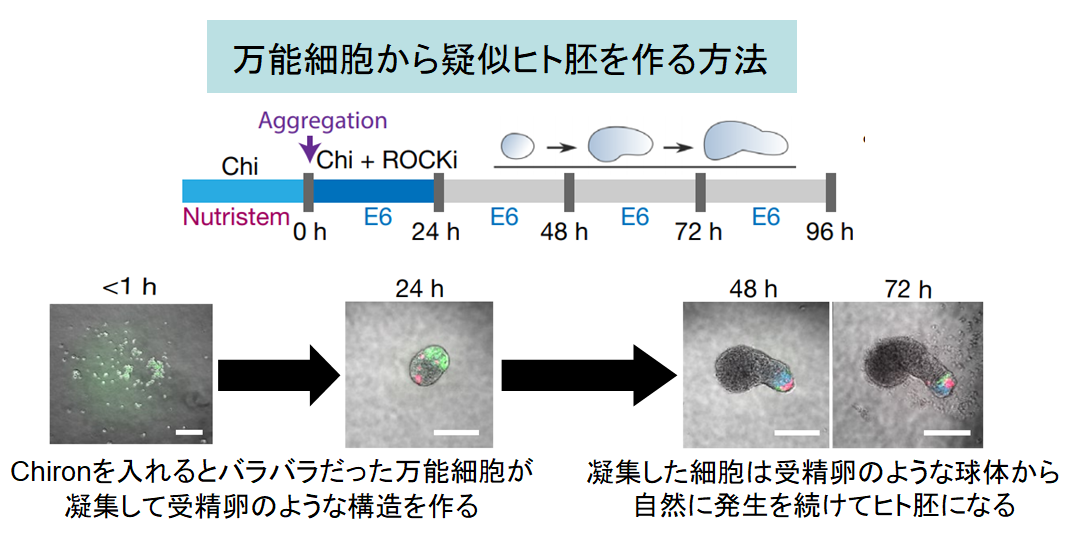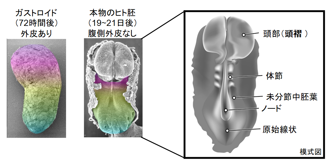 この疑似ヒト胚は精子も卵子も必要としないまま受精卵のように成長して、神経系を構成し、初期胎児に似た頭部と尾部を持つ半月状の構造を作りました。