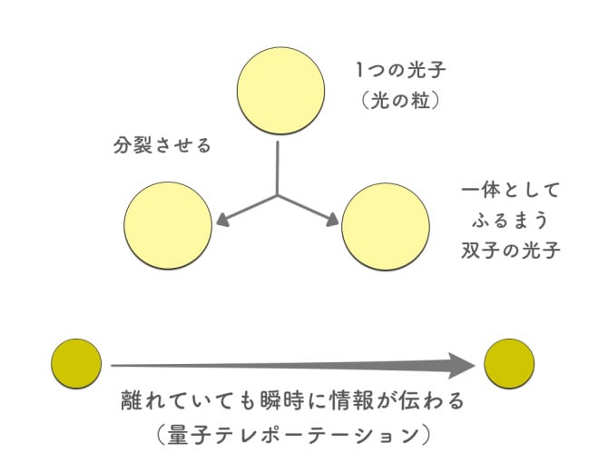 この双子光子は離れていても「瞬時に情報が伝わる」という特性を有しており、この仕組みは量子テレポーテーションと呼ばれています。