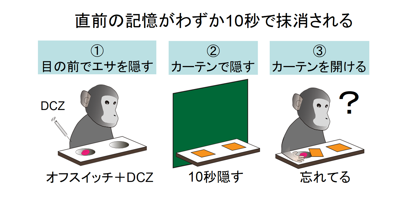 この薬を投与されたサルは僅か10秒ほどで記憶が失われ、目の前で箱に隠されたエサの行方がわからなくなってしまいました。