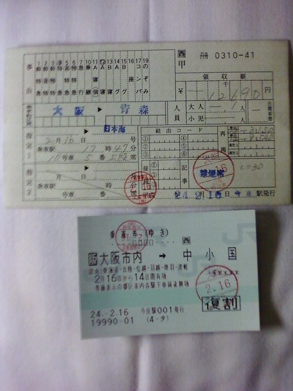 24.-2.16 10:00に寝台特急日本海で空席照会でA寝台が△だったので駅で発券して貰った