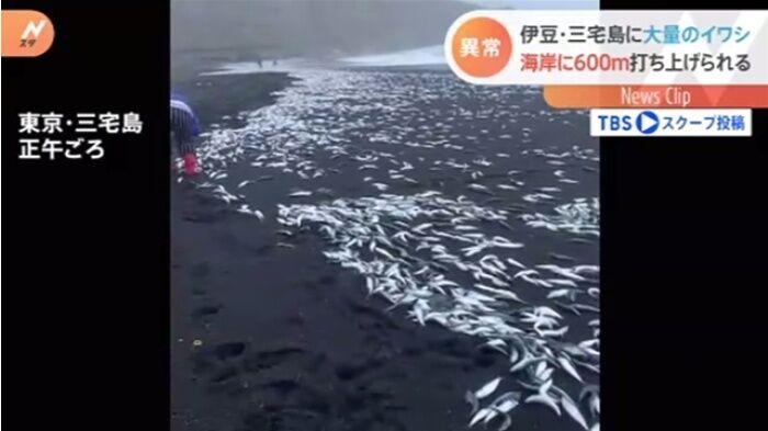 砂浜を埋め尽くした大量の魚。伊豆諸島の三宅島に打ち上げられたイワシです。