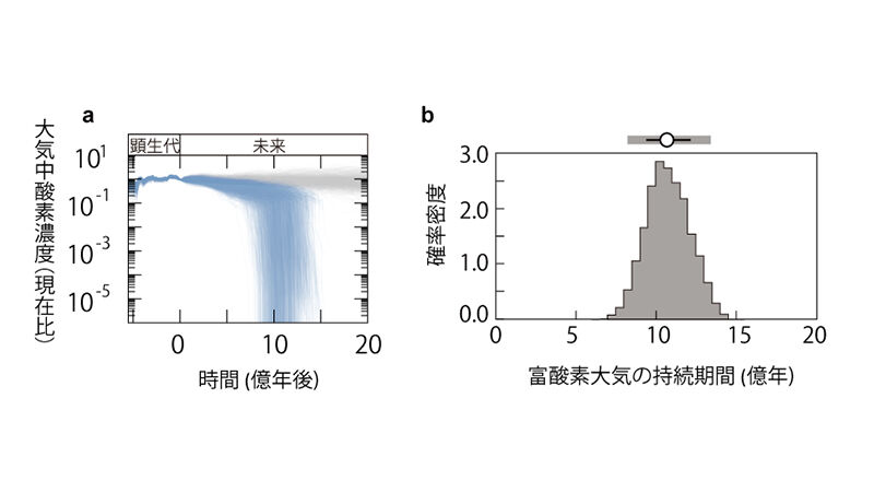 40万通り以上の数値実験の結果から富酸素な地球環境の持続期間を統計的に推定した。