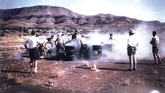 1962年に行われたドラム缶にアスベストをシャベルで入れる大会