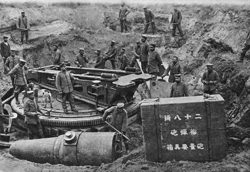 破壊された?28サンチ榴弾砲のまわりに第一次大戦期のドイツ将兵らしき人達が集まっています。