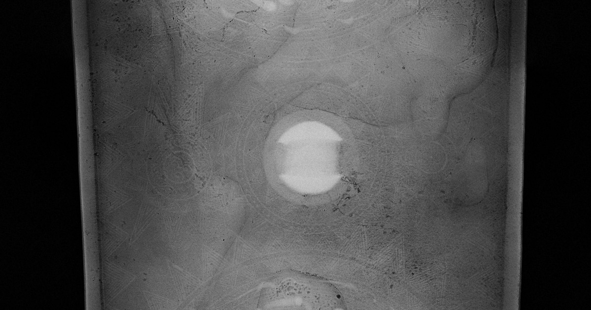 奈良の富雄丸山古墳から「国宝級」の銅鏡・鉄剣が出土 [写真特集5/16] | 毎日新聞鼉龍文盾形銅鏡のX線写真。中央の丸い突起「鈕」の上下にあしらわれた鼉龍は、上と下で回転の向きが逆になっている=奈良県立橿原考古学研究所提供