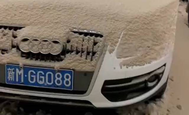 ・2018年12月1日、新疆ウイグル・新疆市で、大気汚染が深刻化する中、大雪が降り、黄色い雪が積もった。