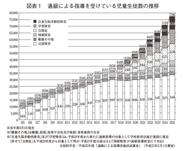 通級による指導を受けている児童生徒数の推移を見てみると、この十数年の間に発達障害の子どもの数が大幅に増加していることがわかります(図表1)。平成18年と平成25年の人数を比較してみると、自閉症は約3.1倍、注意欠陥多動性障害は約6.3倍、学習障害は約8倍に増えています。